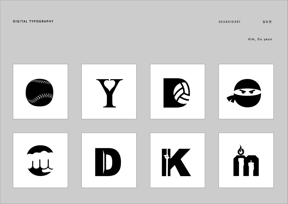 3D 컴퓨터 그래픽스는 걸그룹 '뉴진스'의 응원봉인 '빙키봉'을 광고하기 위한 목적으로 제작했다. 타이포그래피의 1번 사진과 2번 사진은 글자와 아이콘의 결합으로 형태와 반형태를 나타낸 것이다. 3번 사진은 글자를 이용해 타입 패턴을 제작했다. 정보디자인의 1번 사진은 nc 다이노스 소속인 야구선수 김주원의 정보디자인이다. 2번 사진은 글러브의 종류와 차이점에 대해 인포그래픽을 제작했다. 3번 사진은 nc 다이노스 소속 야구선수 박민우의 인포그래픽이다. 4번 사진은 3번을 기반으로 제작한 박민우에 대한 포스터이다.